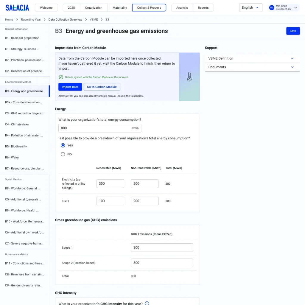 Voluntary ESG reporting can often feel challenging , especially for mid-sized companies without large sustainability teams. Our VSME module simplifies the process, helping you focus on what matters without getting lost in complexity. Whether you're anticipating future regulation or responding to investor and customer expectations, we help you build a clear, structured ESG story that fits your organisation.